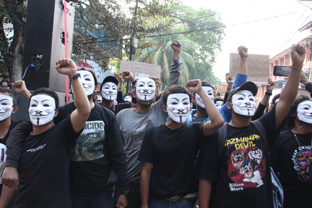 “Memakai topeng sebagai bentuk perlawanan. Karena kenapa, hari ini masih banyak intimidasi-intimidasi yang dilakukan para penguasa. Maka kita akan lawan terus,” imbuh Shandy kepada BantenExpres disela mimbar.