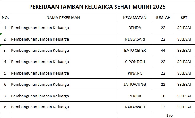 Maka, di tahun 2025 program ini dilanjutkan dengan target 176 unit jamban sehat pada anggaran APBD murni dengan menyasar keluarga berpenghasilan rendah yang ada di 7 Kecamatan di Kota Tangerang. Sementara untuk anggaran perubahan rencananya kami akan membangun lagi sebanyak 132 unit jamban sehat.