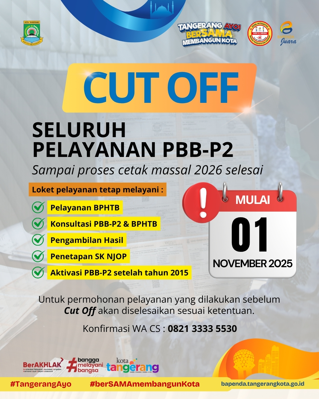 TANGERANG — Dalam rangka proses cetak massal SPPT PBB-P2 Tahun Pajak 2026, Badan Pendapatan Daerah (Bapenda) Kota Tangerang memberlakukan cut off atau penghentian sementara seluruh pelayanan Pajak Bumi dan Bangunan Perdesaan dan Perkotaan (PBB-P2), mulai 1 November 2025.