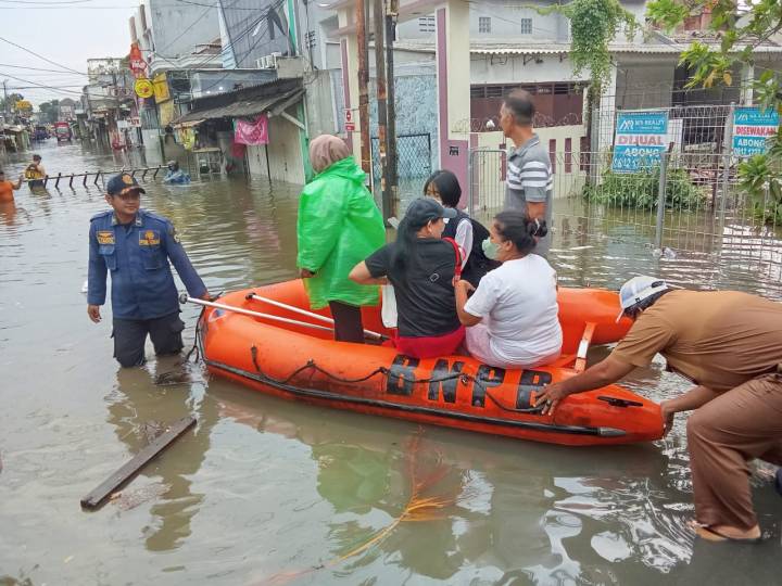Petugas BPBD Kota Tangerang sedang mengevakuasi warga yang sedang banjir.