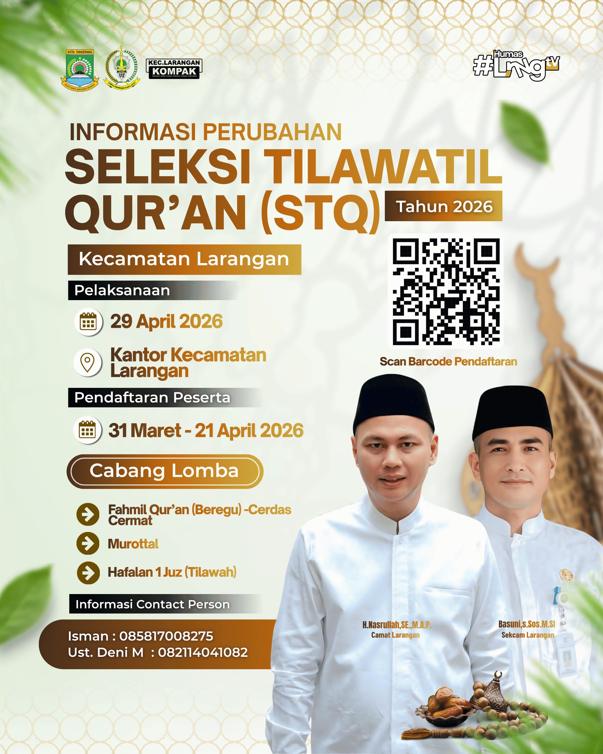 Pelaksanaan STQ Kecamatan Larangan Tahun 2026 akan digelar pada Rabu, 29 April 2026 di Kantor Kecamatan Larangan, Kota Tangerang. STQ tidak hanya menjadi kompetisi, tetapi juga sarana pembinaan mental spiritual serta penguatan nilai-nilai keislaman di tengah masyarakat. (ADV)